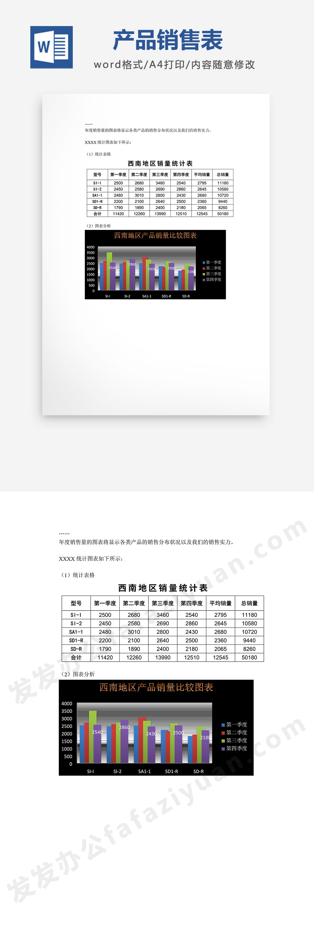 本作品内容为产品销售表Word模板, 格式为 docx, 大小1 MB, 页数为1, 请使用软件Word打开, 作品中主体文字及图片可替换修改,文字修改可直接点击文本框进行编辑,图片更改可选中图片后单击鼠标右键选择更换图片,也可根据自身需求增加和删除作品中的内容, 源文件无水印, 欢迎使用发发资源库。
