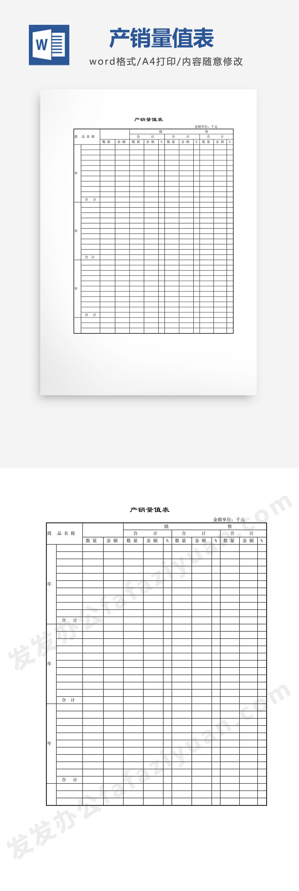 本作品内容为产销量值表Word模板, 格式为 docx, 大小1 MB, 页数为1, 请使用软件Word打开, 作品中主体文字及图片可替换修改,文字修改可直接点击文本框进行编辑,图片更改可选中图片后单击鼠标右键选择更换图片,也可根据自身需求增加和删除作品中的内容, 源文件无水印, 欢迎使用发发资源库。