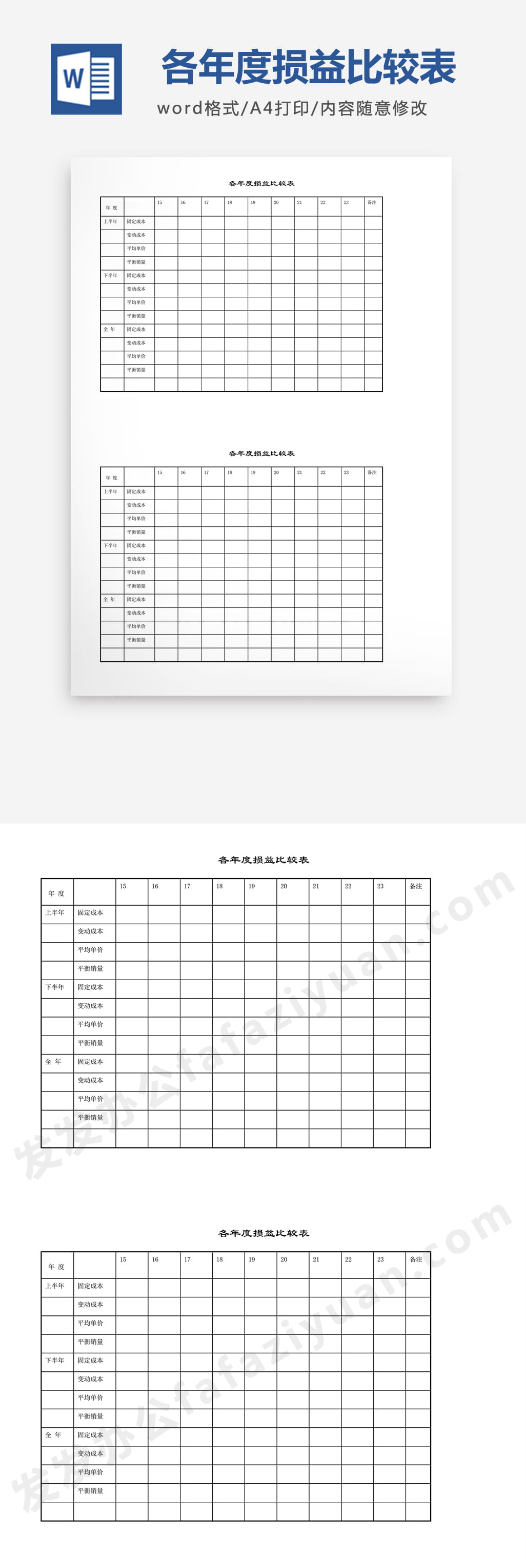 本作品内容为各年度损益比较表Word模板, 格式为 docx, 大小1 MB, 页数为1, 请使用软件Word打开, 作品中主体文字及图片可替换修改,文字修改可直接点击文本框进行编辑,图片更改可选中图片后单击鼠标右键选择更换图片,也可根据自身需求增加和删除作品中的内容, 源文件无水印, 欢迎使用发发资源库。