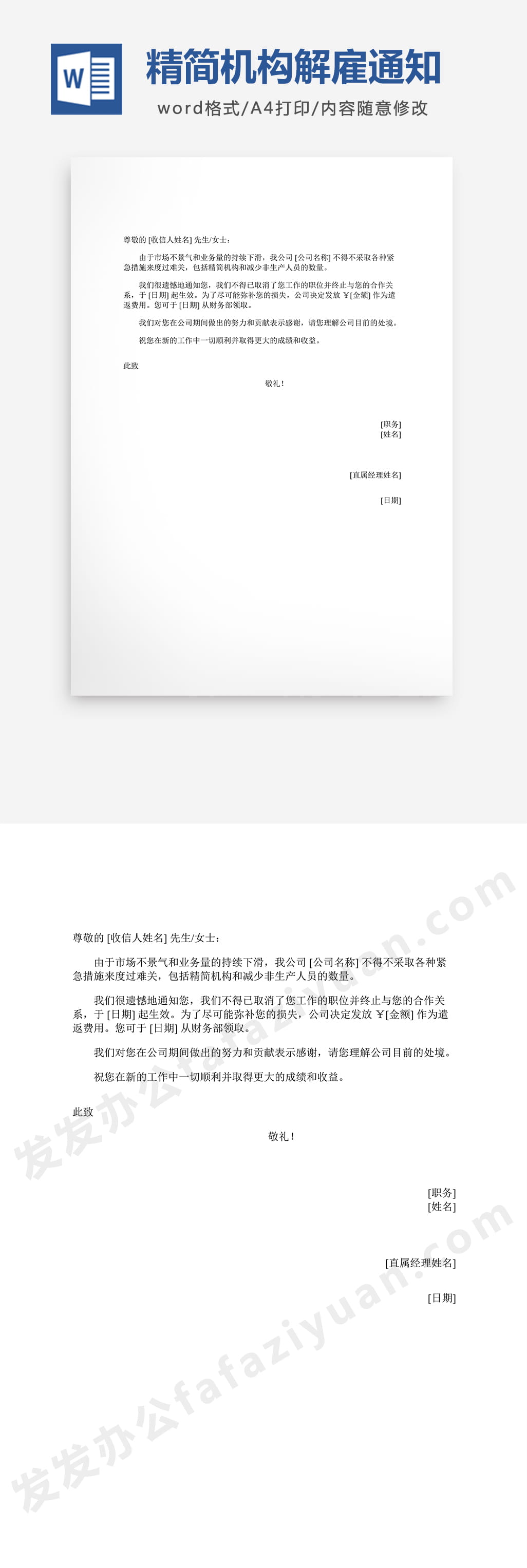 本作品内容为精简机构解雇通知Word模板免费下载, 格式为 docx, 大小1 MB, 页数为1, 请使用软件Word打开, 作品中主体文字及图片可替换修改,文字修改可直接点击文本框进行编辑,图片更改可选中图片后单击鼠标右键选择更换图片,也可根据自身需求增加和删除作品中的内容, 源文件无水印, 欢迎使用发发资源库。