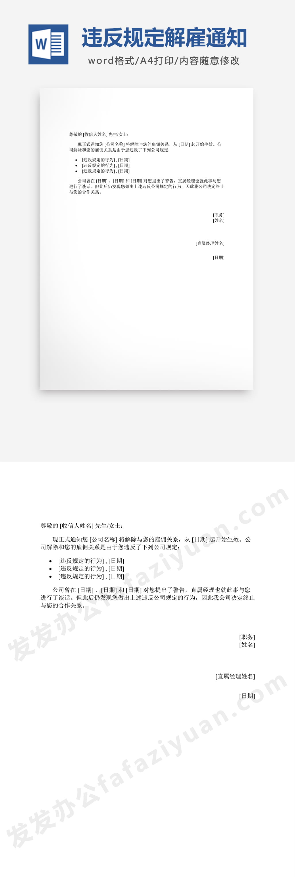 本作品内容为违反公司规定解雇通知Word模板免费下载, 格式为 docx, 大小1 MB, 页数为1, 请使用软件Word打开, 作品中主体文字及图片可替换修改,文字修改可直接点击文本框进行编辑,图片更改可选中图片后单击鼠标右键选择更换图片,也可根据自身需求增加和删除作品中的内容, 源文件无水印, 欢迎使用发发资源库。