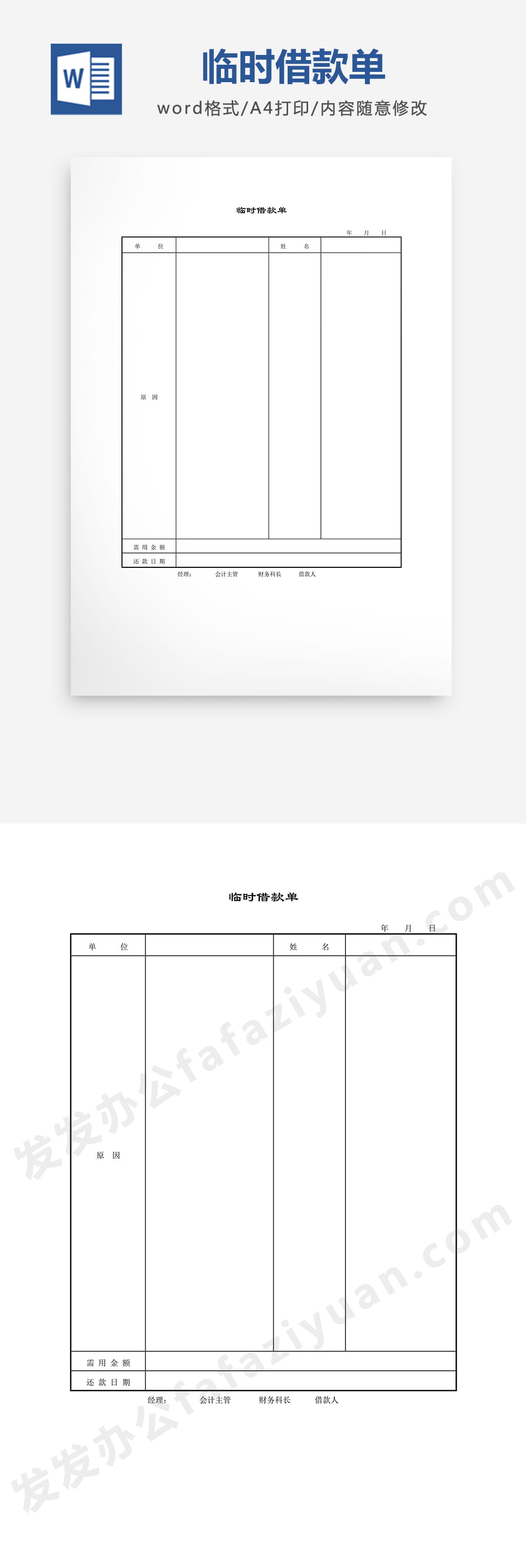 本作品内容为临时借款单Word模板免费下载, 格式为 docx, 大小1 MB, 页数为1, 请使用软件Word打开, 作品中主体文字及图片可替换修改,文字修改可直接点击文本框进行编辑,图片更改可选中图片后单击鼠标右键选择更换图片,也可根据自身需求增加和删除作品中的内容, 源文件无水印, 欢迎使用发发资源库。