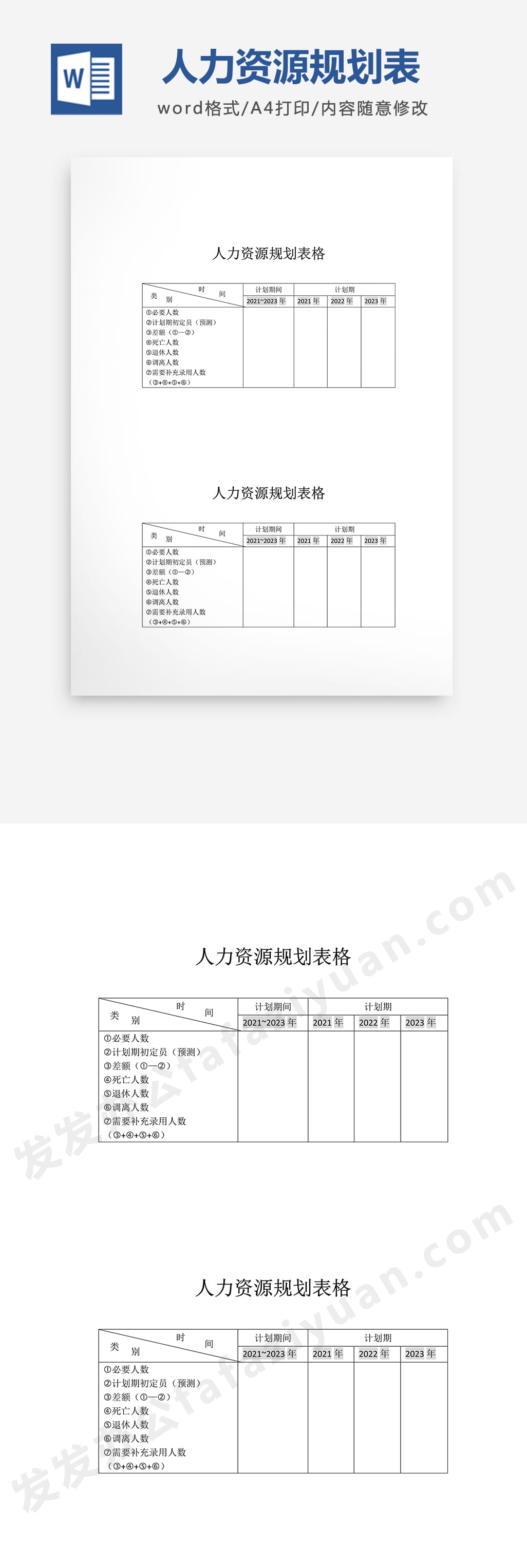 本作品内容为人力资源规划表格Word模板免费下载, 格式为 docx, 大小1 MB, 页数为1, 请使用软件Word打开, 作品中主体文字及图片可替换修改,文字修改可直接点击文本框进行编辑,图片更改可选中图片后单击鼠标右键选择更换图片,也可根据自身需求增加和删除作品中的内容, 源文件无水印, 欢迎使用发发资源库。