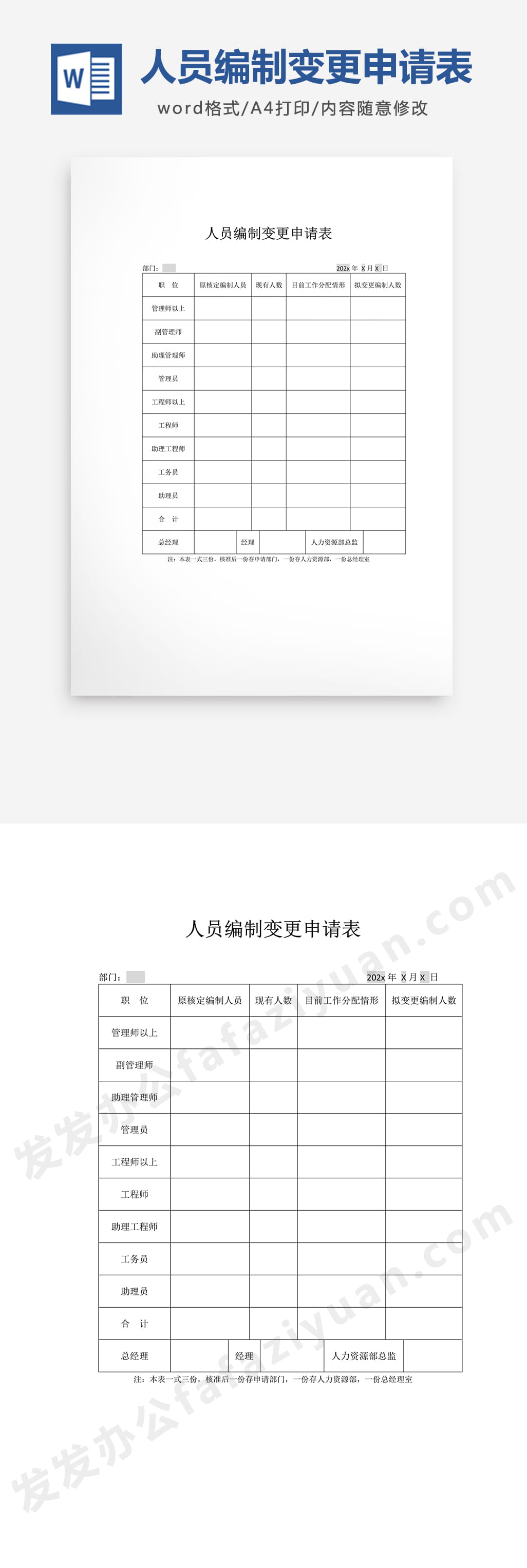 本作品内容为人员编制变更申请表Word模板免费下载, 格式为 docx, 大小1 MB, 页数为1, 请使用软件Word打开, 作品中主体文字及图片可替换修改,文字修改可直接点击文本框进行编辑,图片更改可选中图片后单击鼠标右键选择更换图片,也可根据自身需求增加和删除作品中的内容, 源文件无水印, 欢迎使用发发资源库。