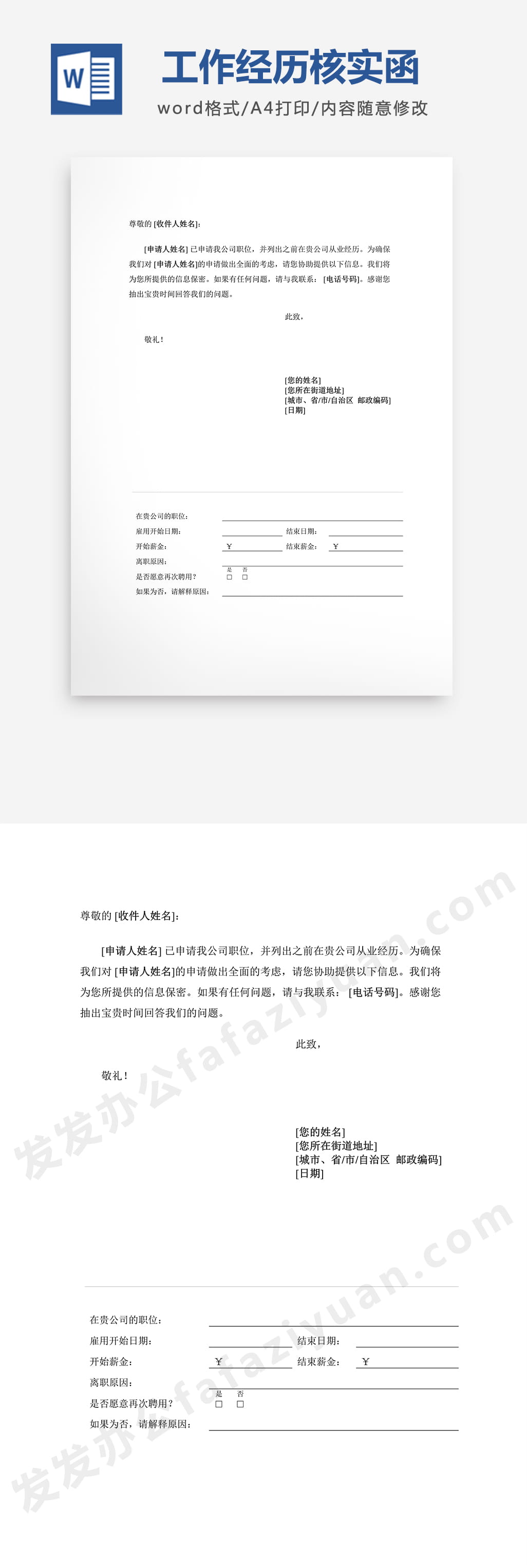 本作品内容为以往工作经历核实函Word模板, 格式为 docx, 大小1 MB, 页数为1, 请使用软件Word打开, 作品中主体文字及图片可替换修改,文字修改可直接点击文本框进行编辑,图片更改可选中图片后单击鼠标右键选择更换图片,也可根据自身需求增加和删除作品中的内容, 源文件无水印, 欢迎使用发发资源库。 资源下载此资源下载价格为8.8F币,VIP免费,请先登录