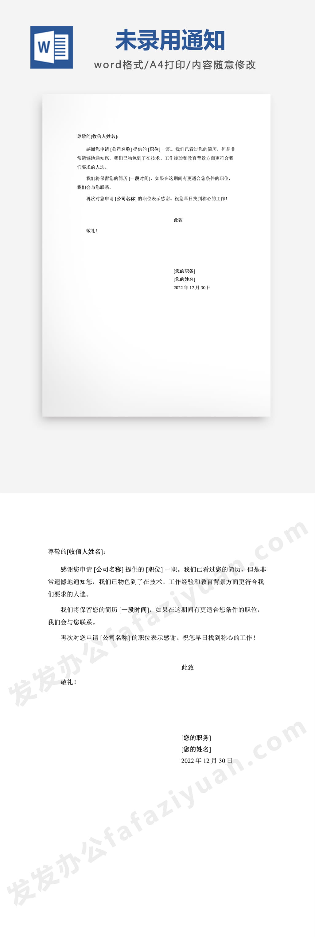 本作品内容为未录用通知Word模板免费下载, 格式为 docx, 大小1 MB, 页数为1, 请使用软件Word打开, 作品中主体文字及图片可替换修改,文字修改可直接点击文本框进行编辑,图片更改可选中图片后单击鼠标右键选择更换图片,也可根据自身需求增加和删除作品中的内容, 源文件无水印, 欢迎使用发发资源库。