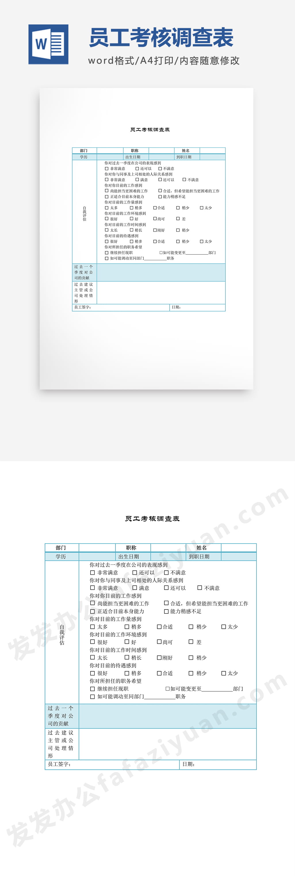 本作品内容为员工考核调查表Word模板, 格式为 docx, 大小1 MB, 页数为1, 请使用软件Word打开, 作品中主体文字及图片可替换修改,文字修改可直接点击文本框进行编辑,图片更改可选中图片后单击鼠标右键选择更换图片,也可根据自身需求增加和删除作品中的内容, 源文件无水印, 欢迎使用发发资源库。