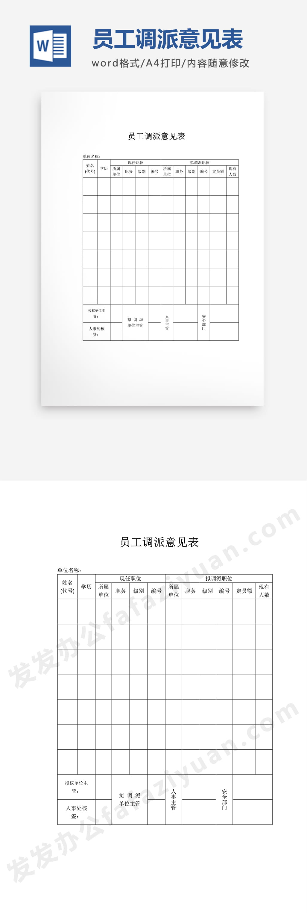 本作品内容为员工调派意见表Word模板, 格式为 docx, 大小1 MB, 页数为1, 请使用软件Word打开, 作品中主体文字及图片可替换修改,文字修改可直接点击文本框进行编辑,图片更改可选中图片后单击鼠标右键选择更换图片,也可根据自身需求增加和删除作品中的内容, 源文件无水印, 欢迎使用发发资源库。