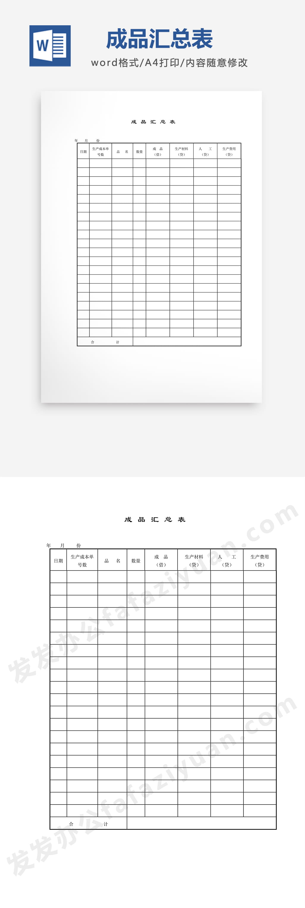 本作品内容为成品汇总表Word模板免费下载, 格式为 docx, 大小1 MB, 页数为1, 请使用软件Word打开, 作品中主体文字及图片可替换修改,文字修改可直接点击文本框进行编辑,图片更改可选中图片后单击鼠标右键选择更换图片,也可根据自身需求增加和删除作品中的内容, 源文件无水印, 欢迎使用发发资源库。