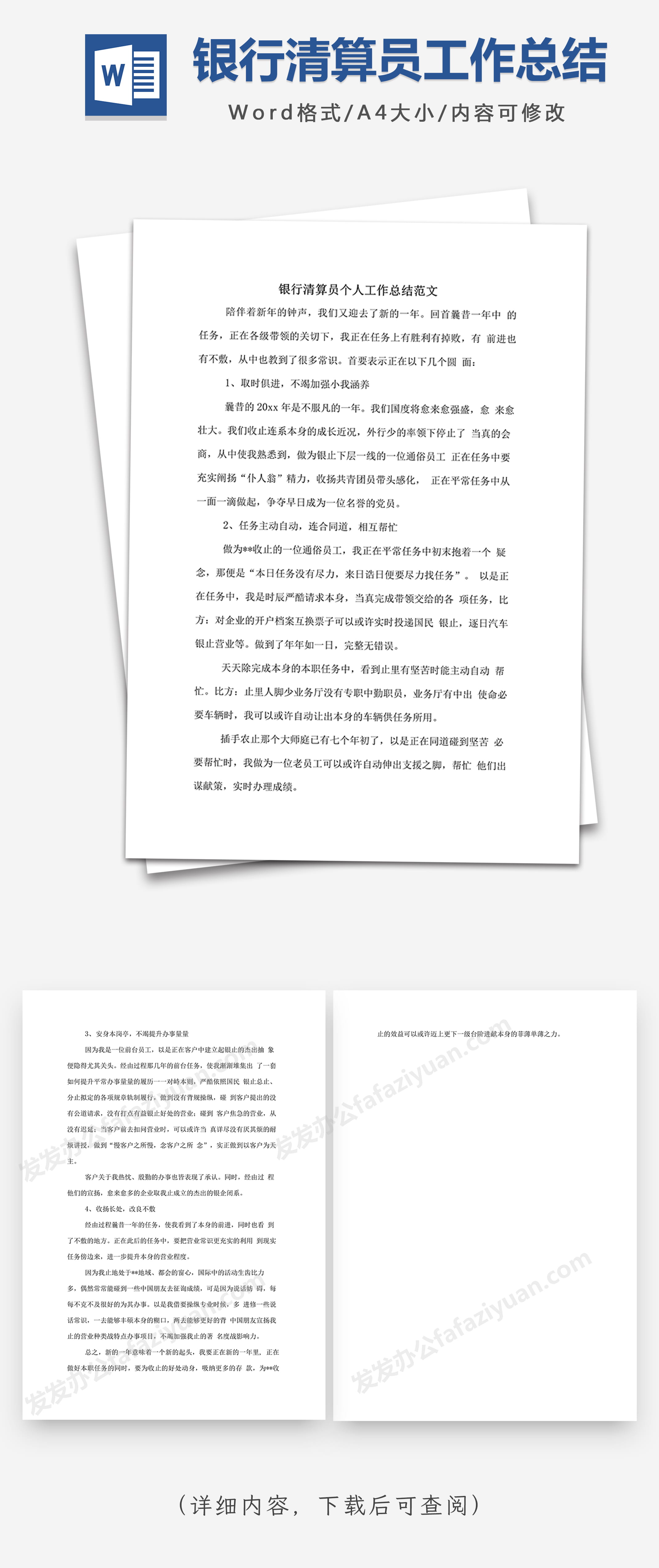 本作品内容为银行清算员个人工作总结范文Word模板, 格式为 docx, 大小1 MB, 页数为3, 请使用软件Word打开, 作品中主体文字及图片可替换修改,文字修改可直接点击文本框进行编辑,图片更改可选中图片后单击鼠标右键选择更换图片,也可根据自身需求增加和删除作品中的内容, 源文件无水印, 欢迎使用发发资源库。