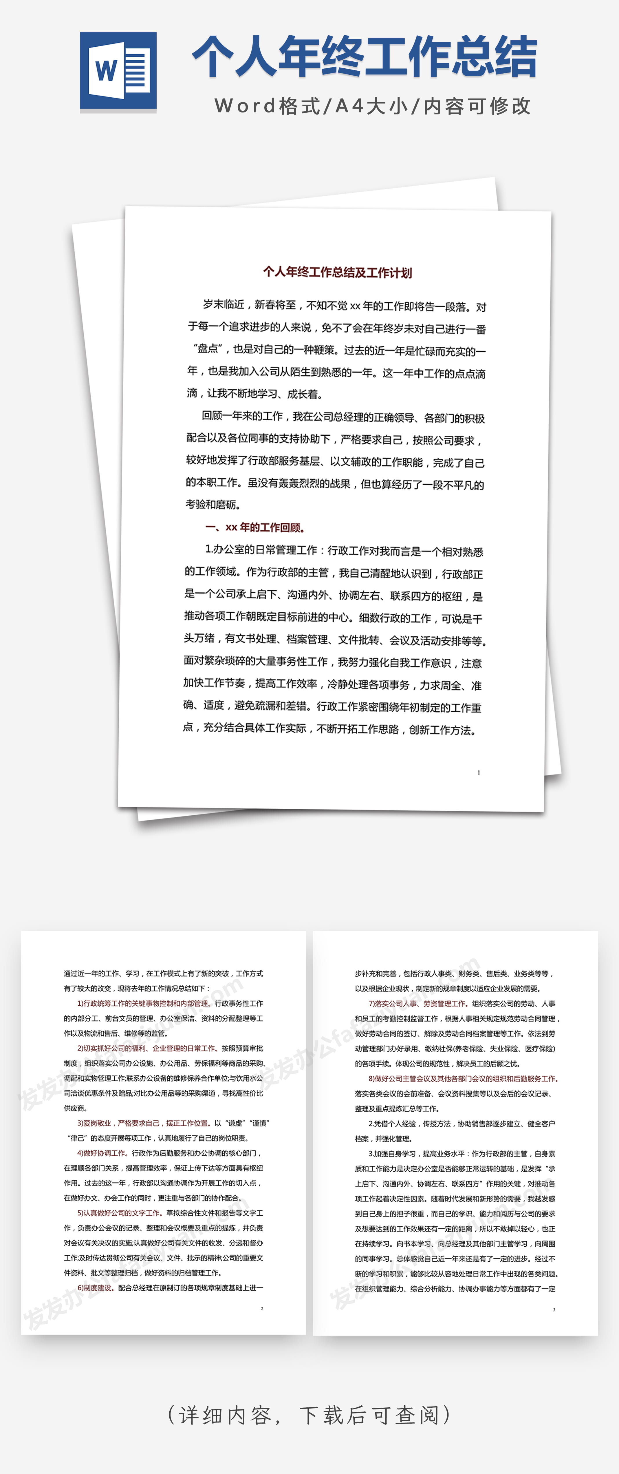 本作品内容为个人年终工作总结及工作计划Word范文, 格式为 docx, 大小1 MB, 页数为8, 请使用软件Word打开, 作品中主体文字及图片可替换修改,文字修改可直接点击文本框进行编辑,图片更改可选中图片后单击鼠标右键选择更换图片,也可根据自身需求增加和删除作品中的内容, 源文件无水印, 欢迎使用发发资源库。