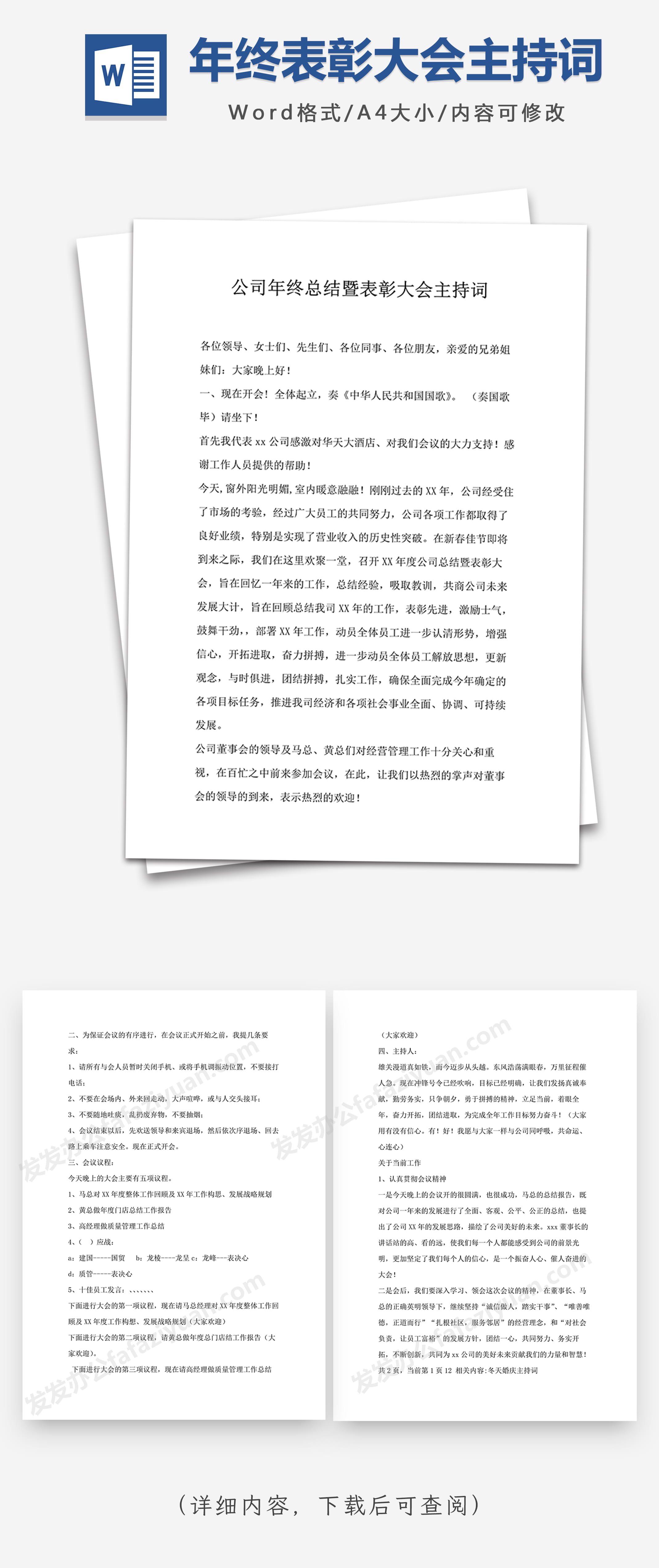 本作品内容为公司年终总结暨表彰大会主持词Word范文, 格式为 docx, 大小1 MB, 页数为6, 请使用软件Word打开, 作品中主体文字及图片可替换修改,文字修改可直接点击文本框进行编辑,图片更改可选中图片后单击鼠标右键选择更换图片,也可根据自身需求增加和删除作品中的内容, 源文件无水印, 欢迎使用发发资源库。 资源下载此资源下载价格为8.8F币,VIP免费,请先登录