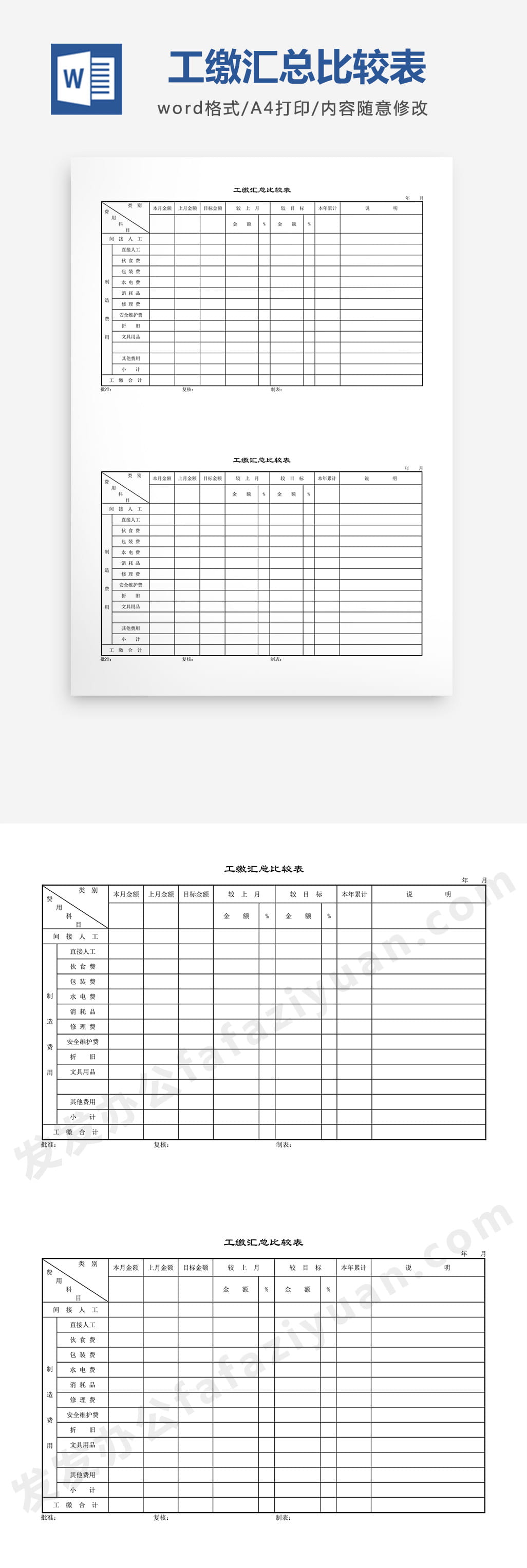 本作品内容为工缴汇总比较表Word模板, 格式为 docx, 大小1 MB, 页数为1, 请使用软件Word打开, 作品中主体文字及图片可替换修改,文字修改可直接点击文本框进行编辑,图片更改可选中图片后单击鼠标右键选择更换图片,也可根据自身需求增加和删除作品中的内容, 源文件无水印, 欢迎使用发发资源库。