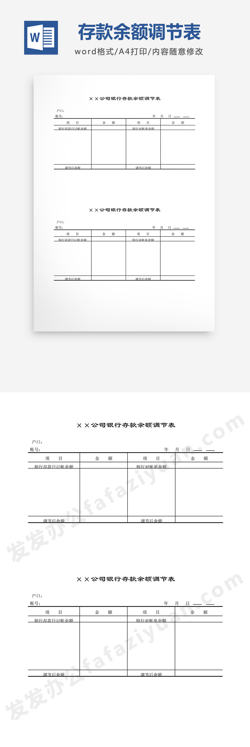 本作品内容为公司银行存款余额调节表Word模板免费下载, 格式为 docx, 大小1 MB, 页数为1, 请使用软件Word打开, 作品中主体文字及图片可替换修改,文字修改可直接点击文本框进行编辑,图片更改可选中图片后单击鼠标右键选择更换图片,也可根据自身需求增加和删除作品中的内容, 源文件无水印, 欢迎使用发发资源库。