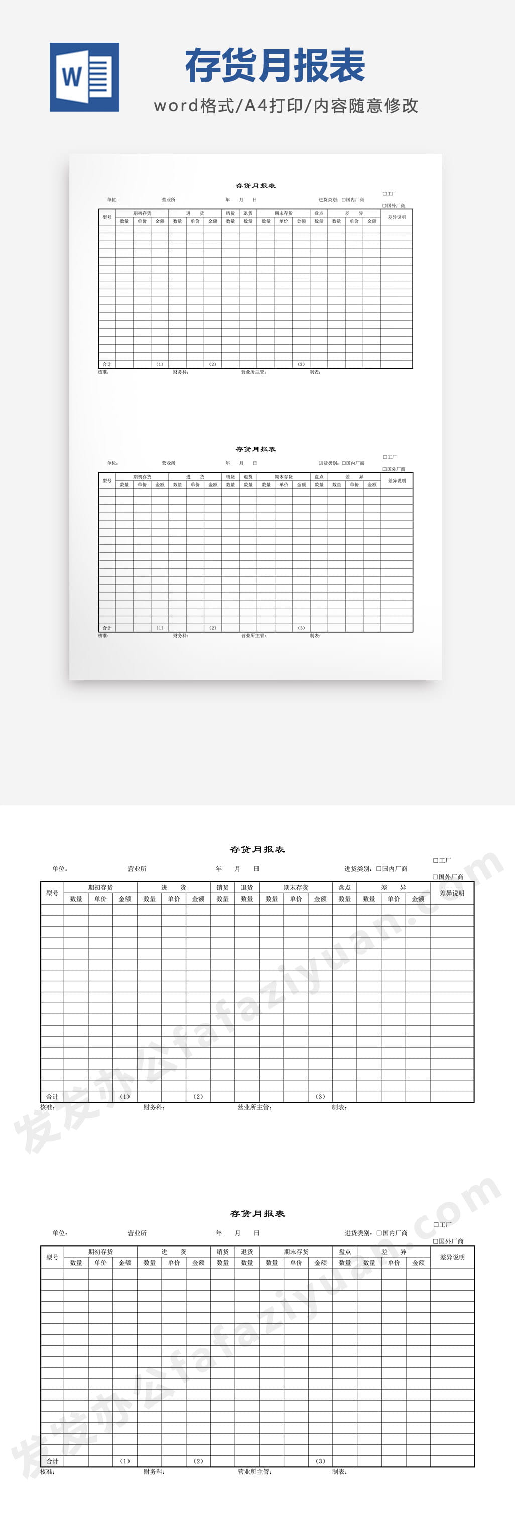 本作品内容为存货月报表Word模板, 格式为 docx, 大小1 MB, 页数为1, 请使用软件Word打开, 作品中主体文字及图片可替换修改,文字修改可直接点击文本框进行编辑,图片更改可选中图片后单击鼠标右键选择更换图片,也可根据自身需求增加和删除作品中的内容, 源文件无水印, 欢迎使用发发资源库。