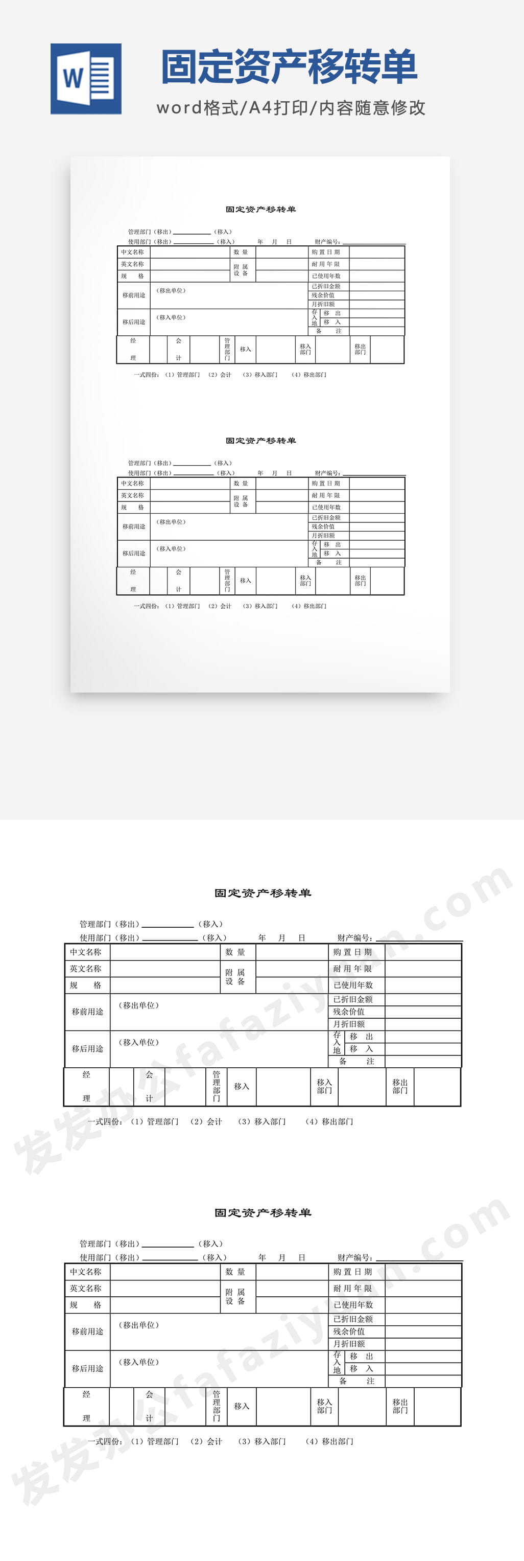 本作品内容为固定资产移转单Word模板, 格式为 docx, 大小1 MB, 页数为1, 请使用软件Word打开, 作品中主体文字及图片可替换修改,文字修改可直接点击文本框进行编辑,图片更改可选中图片后单击鼠标右键选择更换图片,也可根据自身需求增加和删除作品中的内容, 源文件无水印, 欢迎使用发发资源库。