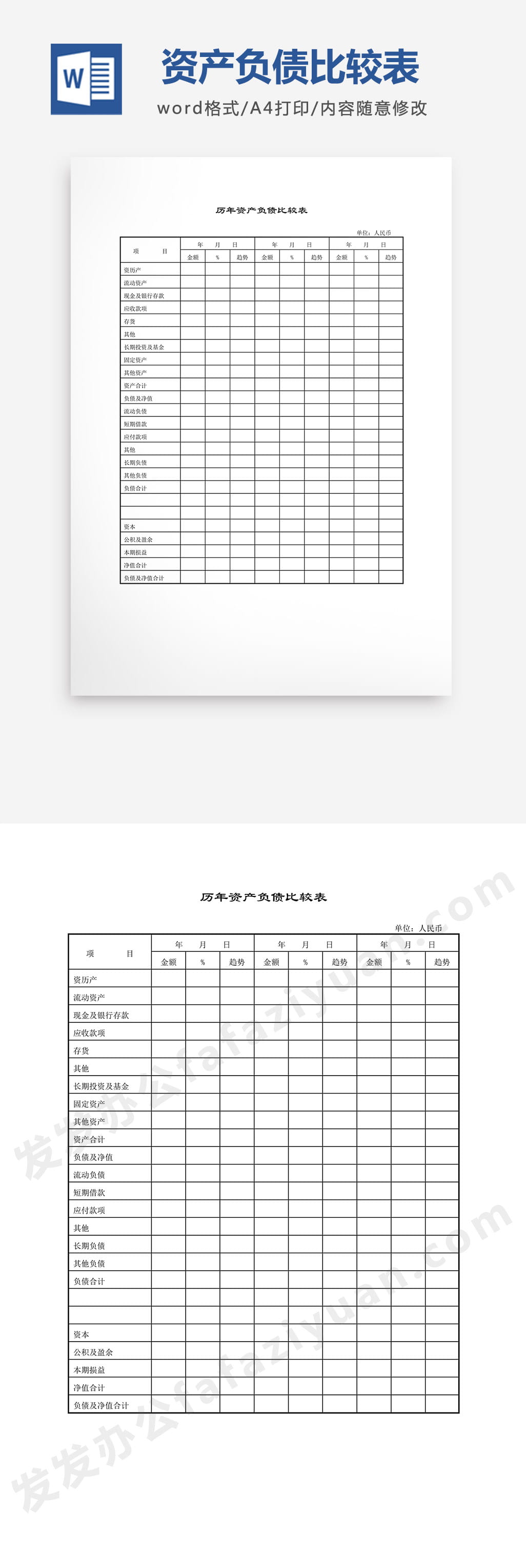 本作品内容为历年资产负债比较表Word模板, 格式为 docx, 大小1 MB, 页数为1, 请使用软件Word打开, 作品中主体文字及图片可替换修改,文字修改可直接点击文本框进行编辑,图片更改可选中图片后单击鼠标右键选择更换图片,也可根据自身需求增加和删除作品中的内容, 源文件无水印, 欢迎使用发发资源库。
