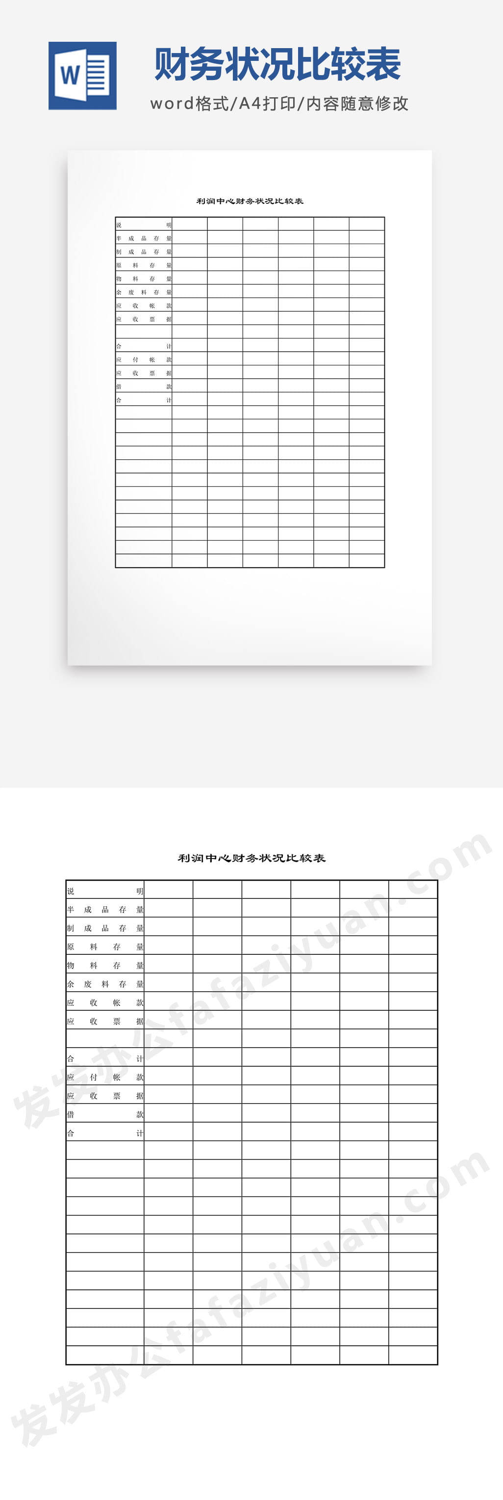 本作品内容为利润中心财务状况比较表Word模板免费下载, 格式为 docx, 大小1 MB, 页数为1, 请使用软件Word打开, 作品中主体文字及图片可替换修改,文字修改可直接点击文本框进行编辑,图片更改可选中图片后单击鼠标右键选择更换图片,也可根据自身需求增加和删除作品中的内容, 源文件无水印, 欢迎使用发发资源库。