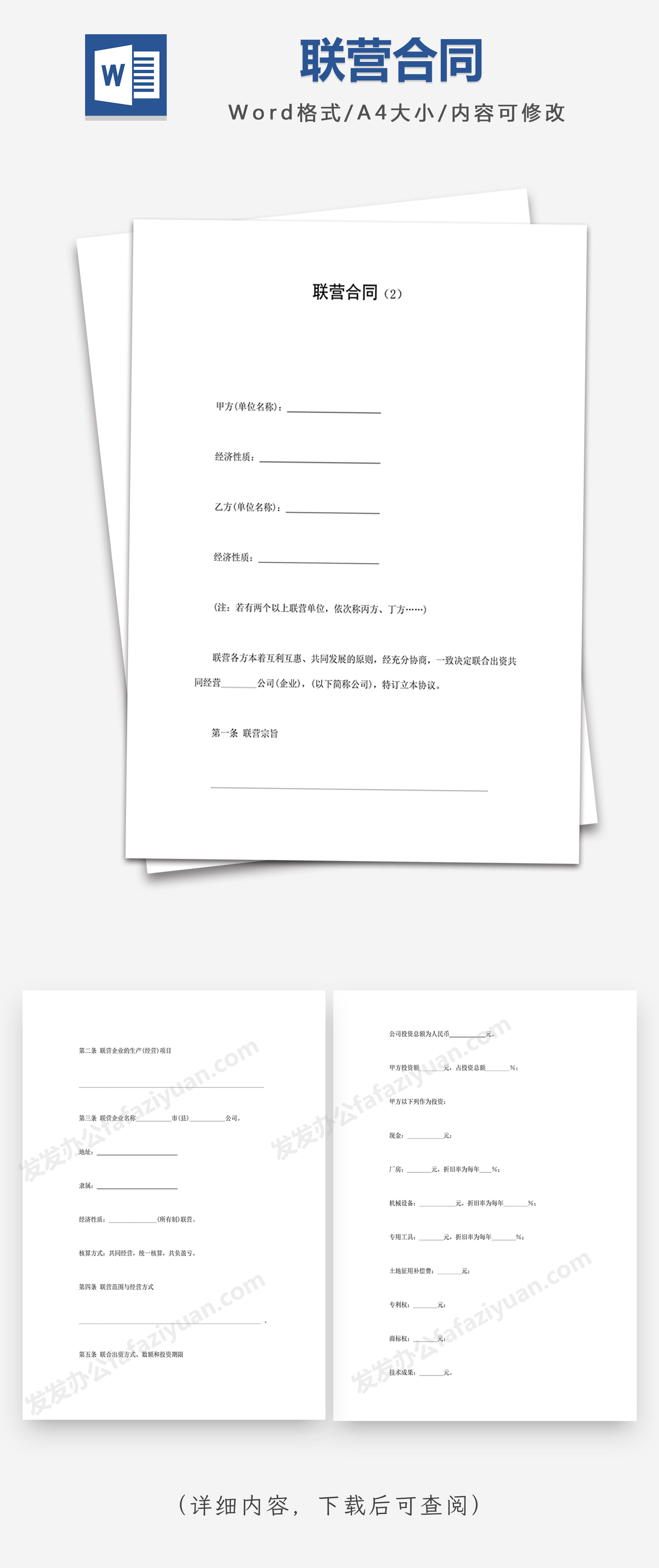 本作品内容为联营合同(2)Word模板, 格式为 docx, 大小1 MB, 页数为8, 请使用软件Word打开, 作品中主体文字及图片可替换修改,文字修改可直接点击文本框进行编辑,图片更改可选中图片后单击鼠标右键选择更换图片,也可根据自身需求增加和删除作品中的内容, 源文件无水印, 欢迎使用发发资源库。