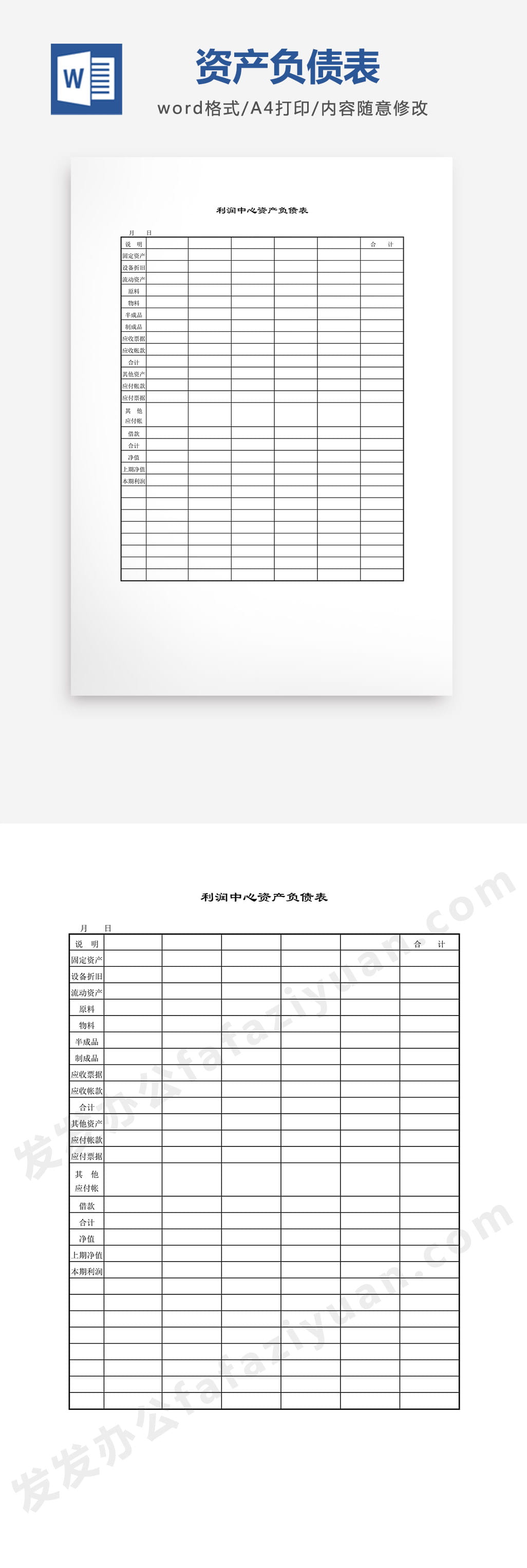 本作品内容为利润中心资产负债表Word模板, 格式为 docx, 大小1 MB, 页数为1, 请使用软件Word打开, 作品中主体文字及图片可替换修改,文字修改可直接点击文本框进行编辑,图片更改可选中图片后单击鼠标右键选择更换图片,也可根据自身需求增加和删除作品中的内容, 源文件无水印, 欢迎使用发发资源库。