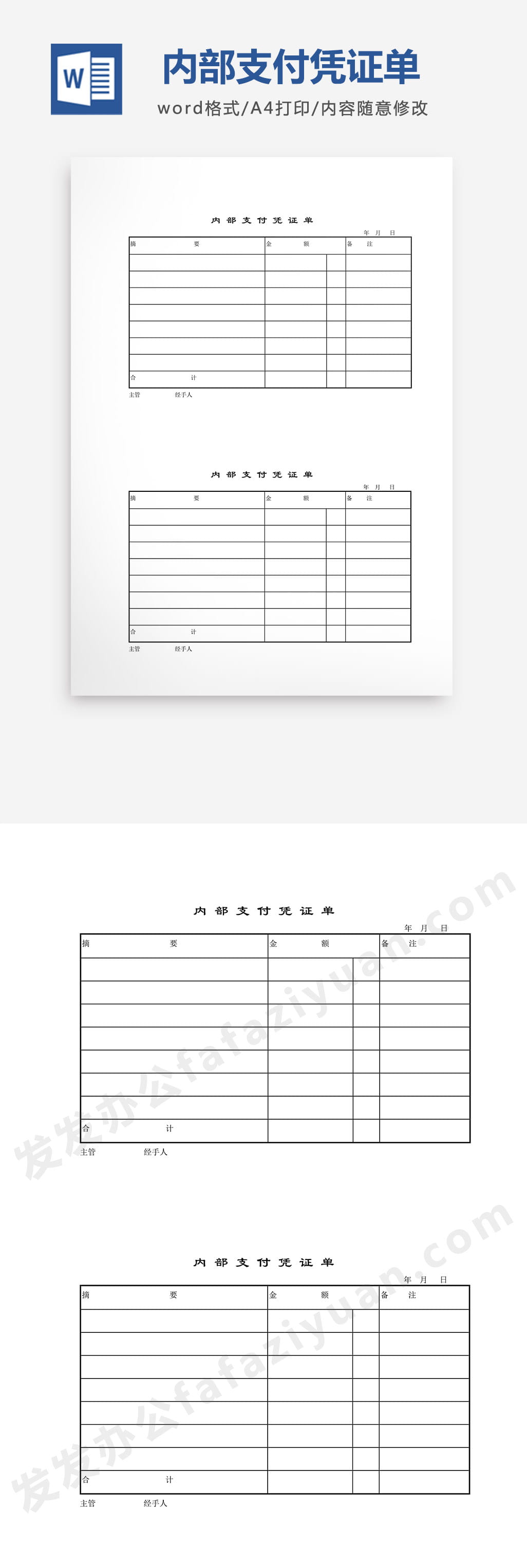 本作品内容为内部支付凭证单Word模板免费下载, 格式为 docx, 大小1 MB, 页数为1, 请使用软件Word打开, 作品中主体文字及图片可替换修改,文字修改可直接点击文本框进行编辑,图片更改可选中图片后单击鼠标右键选择更换图片,也可根据自身需求增加和删除作品中的内容, 源文件无水印, 欢迎使用发发资源库。