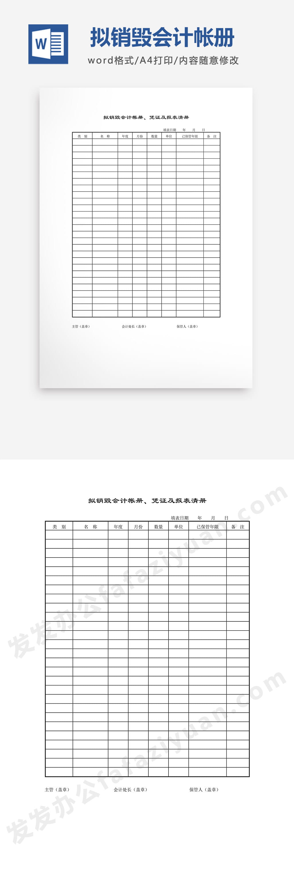 本作品内容为拟销毁会计帐册、凭证及报表清册Word模板, 格式为 docx, 大小1 MB, 页数为1, 请使用软件Word打开, 作品中主体文字及图片可替换修改,文字修改可直接点击文本框进行编辑,图片更改可选中图片后单击鼠标右键选择更换图片,也可根据自身需求增加和删除作品中的内容, 源文件无水印, 欢迎使用发发资源库。