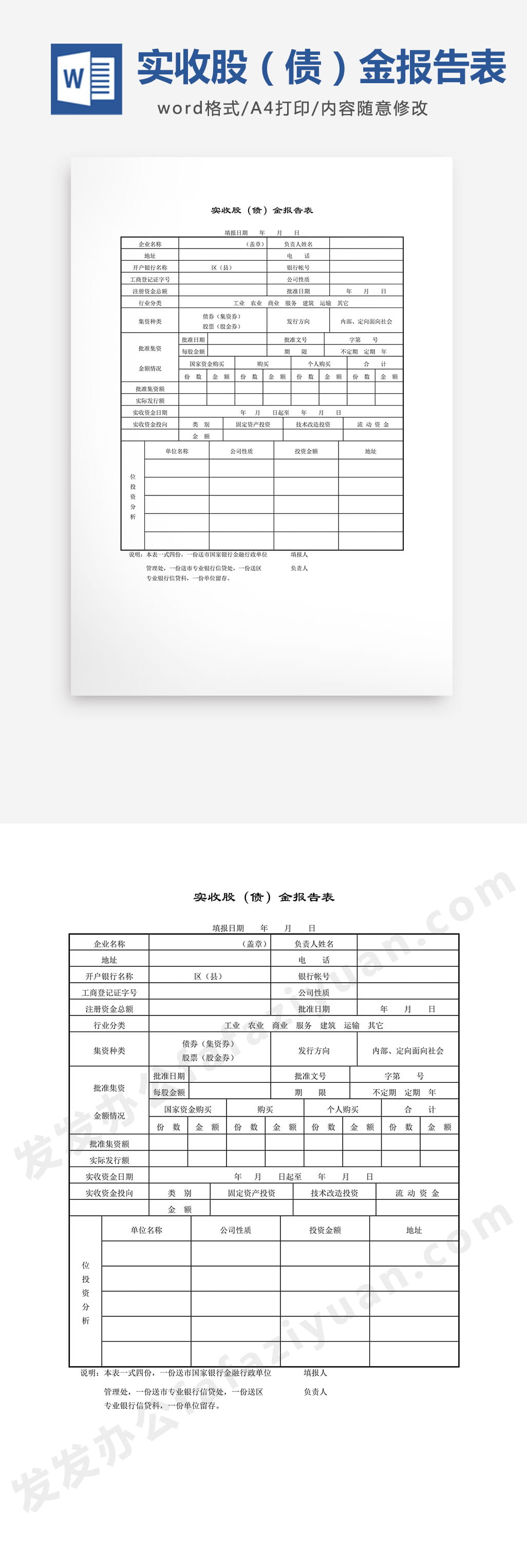 本作品内容为实收股(债)金报告表Word模板, 格式为 docx, 大小1 MB, 页数为1, 请使用软件Word打开, 作品中主体文字及图片可替换修改,文字修改可直接点击文本框进行编辑,图片更改可选中图片后单击鼠标右键选择更换图片,也可根据自身需求增加和删除作品中的内容, 源文件无水印, 欢迎使用发发资源库。
