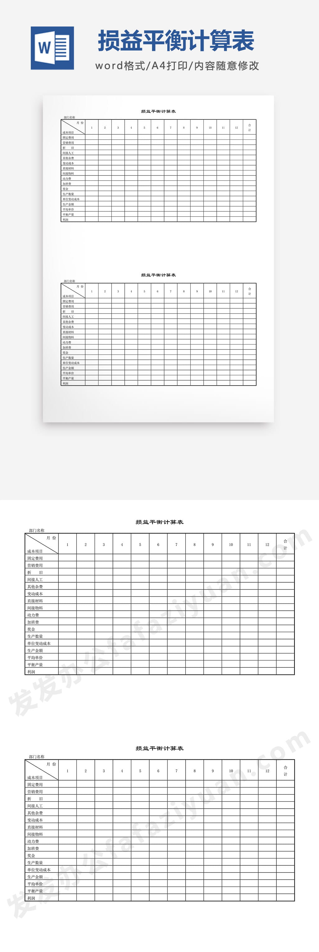 本作品内容为损益平衡计算表Word模板, 格式为 docx, 大小1 MB, 页数为1, 请使用软件Word打开, 作品中主体文字及图片可替换修改,文字修改可直接点击文本框进行编辑,图片更改可选中图片后单击鼠标右键选择更换图片,也可根据自身需求增加和删除作品中的内容, 源文件无水印, 欢迎使用发发资源库。