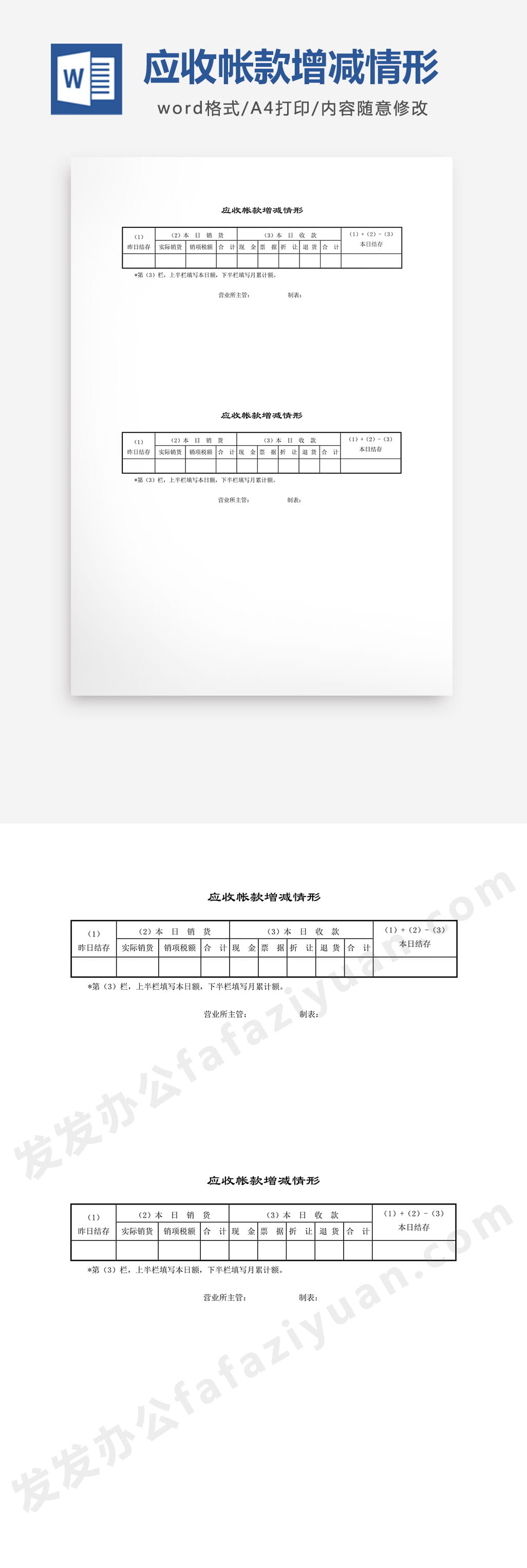 本作品内容为应收帐款增减情形Word模板免费下载, 格式为 docx, 大小1 MB, 页数为1, 请使用软件Word打开, 作品中主体文字及图片可替换修改,文字修改可直接点击文本框进行编辑,图片更改可选中图片后单击鼠标右键选择更换图片,也可根据自身需求增加和删除作品中的内容, 源文件无水印, 欢迎使用发发资源库。