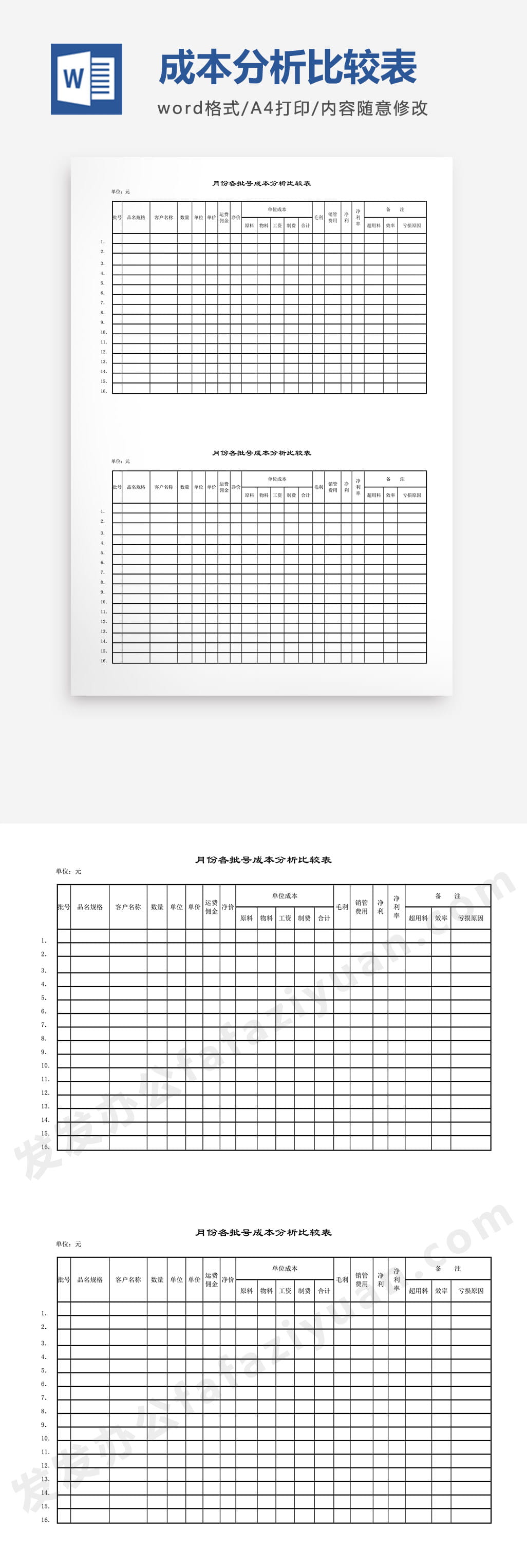 本作品内容为月份各批号成本分析比较表Word模板, 格式为 docx, 大小1 MB, 页数为1, 请使用软件Word打开, 作品中主体文字及图片可替换修改,文字修改可直接点击文本框进行编辑,图片更改可选中图片后单击鼠标右键选择更换图片,也可根据自身需求增加和删除作品中的内容, 源文件无水印, 欢迎使用发发资源库。