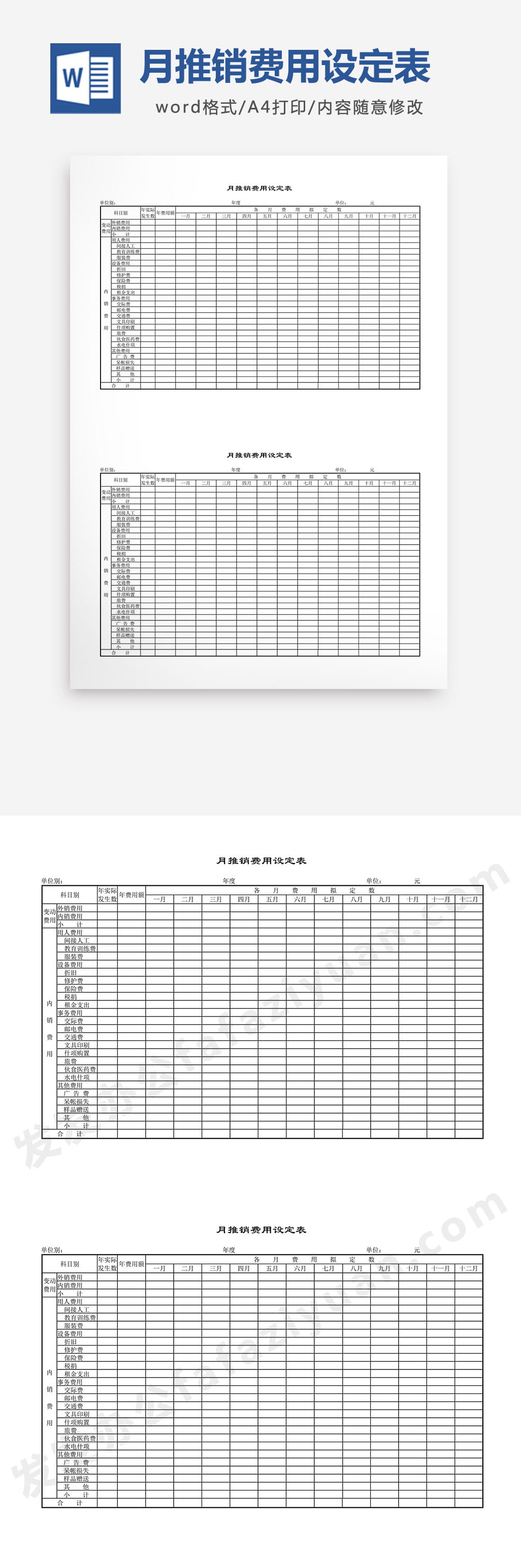 本作品内容为月推销费用设定表Word模板, 格式为 docx, 大小1 MB, 页数为1, 请使用软件Word打开, 作品中主体文字及图片可替换修改,文字修改可直接点击文本框进行编辑,图片更改可选中图片后单击鼠标右键选择更换图片,也可根据自身需求增加和删除作品中的内容, 源文件无水印, 欢迎使用发发资源库。