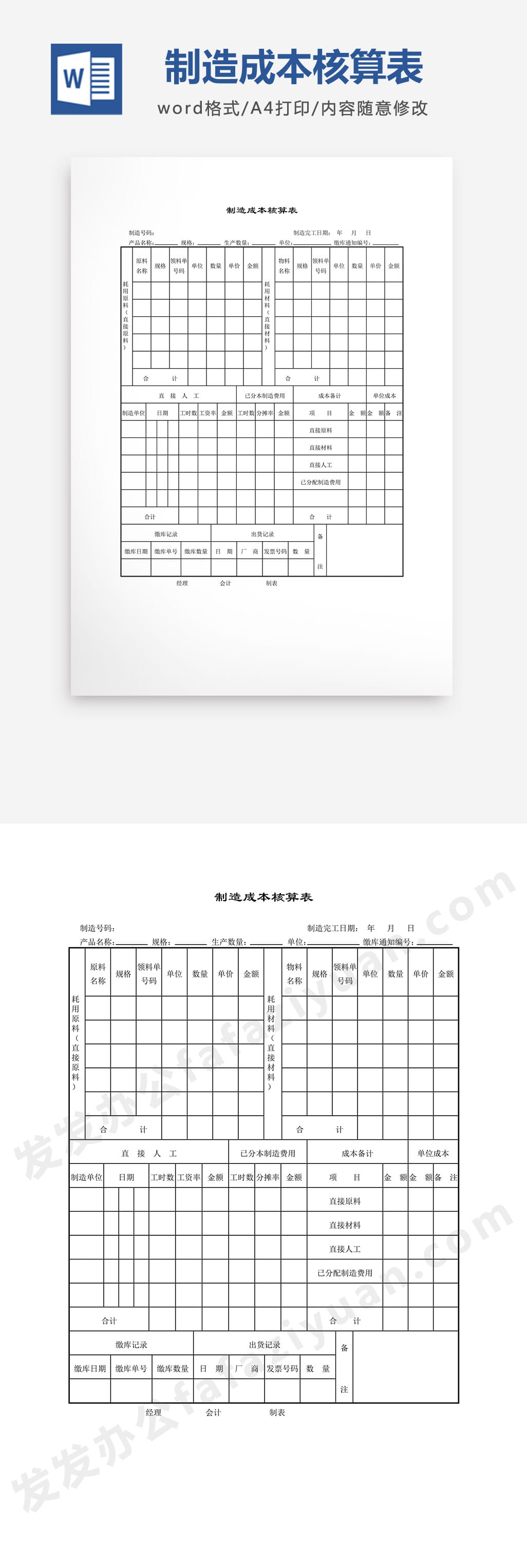 本作品内容为制造成本核算表Word模板, 格式为 docx, 大小1 MB, 页数为1, 请使用软件Word打开, 作品中主体文字及图片可替换修改,文字修改可直接点击文本框进行编辑,图片更改可选中图片后单击鼠标右键选择更换图片,也可根据自身需求增加和删除作品中的内容, 源文件无水印, 欢迎使用发发资源库。