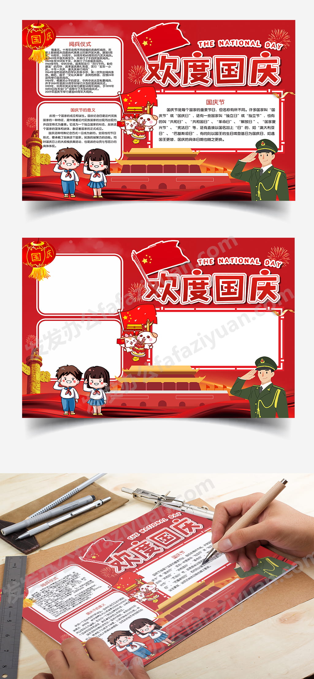 本作品内容为小学生欢度国庆班级小报Word手抄报模板, 格式为 docx, 大小7MB, 页数为1, 请使用软件Word打开, 作品中主体文字及图片可替换修改,文字修改可直接点击文本框进行编辑,图片更改可选中图片后单击鼠标右键选择更换图片,也可根据自身需求增加和删除作品中的内容, 源文件无水印, 欢迎使用发发资源库。