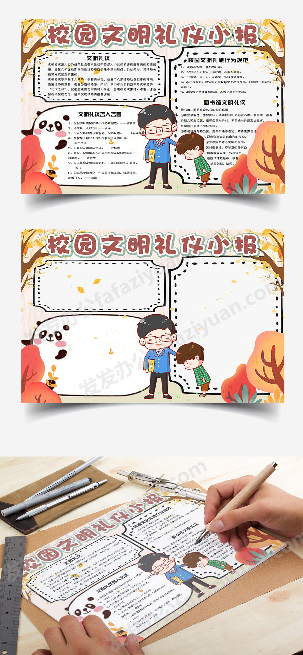 本作品内容为清新卡通校园文明礼仪小报Word手抄报模板, 格式为 doc, 大小12MB, 页数为1, 请使用软件Word打开, 作品中主体文字及图片可替换修改,文字修改可直接点击文本框进行编辑,图片更改可选中图片后单击鼠标右键选择更换图片,也可根据自身需求增加和删除作品中的内容, 源文件无水印, 欢迎使用发发资源库。