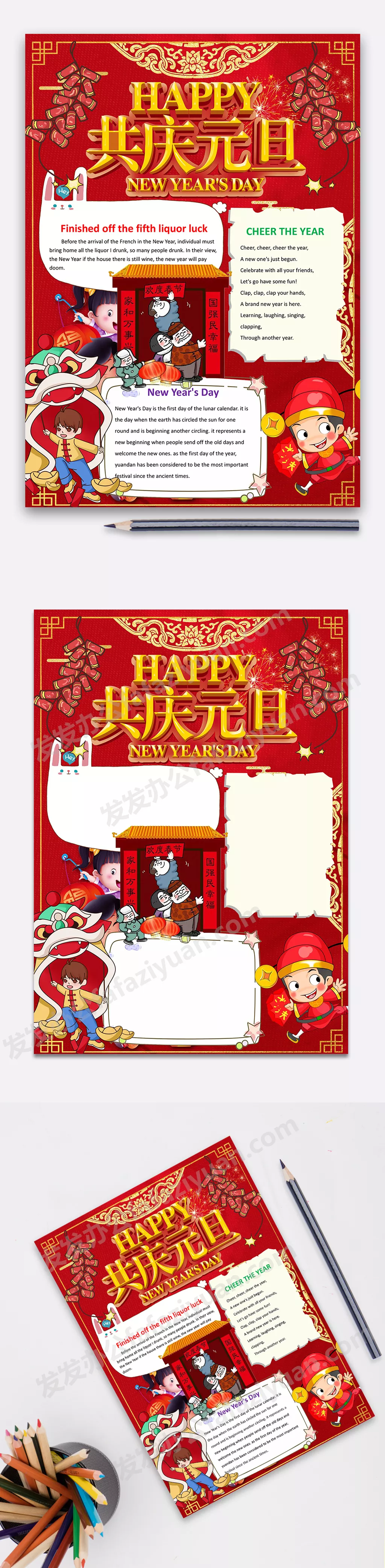 本作品内容为红色共庆元旦电子小报Word手抄报模板, 格式为 docx, 大小3MB, 页数为1, 请使用软件Word打开, 作品中主体文字及图片可替换修改,文字修改可直接点击文本框进行编辑,图片更改可选中图片后单击鼠标右键选择更换图片,也可根据自身需求增加和删除作品中的内容, 源文件无水印, 欢迎使用发发资源库。