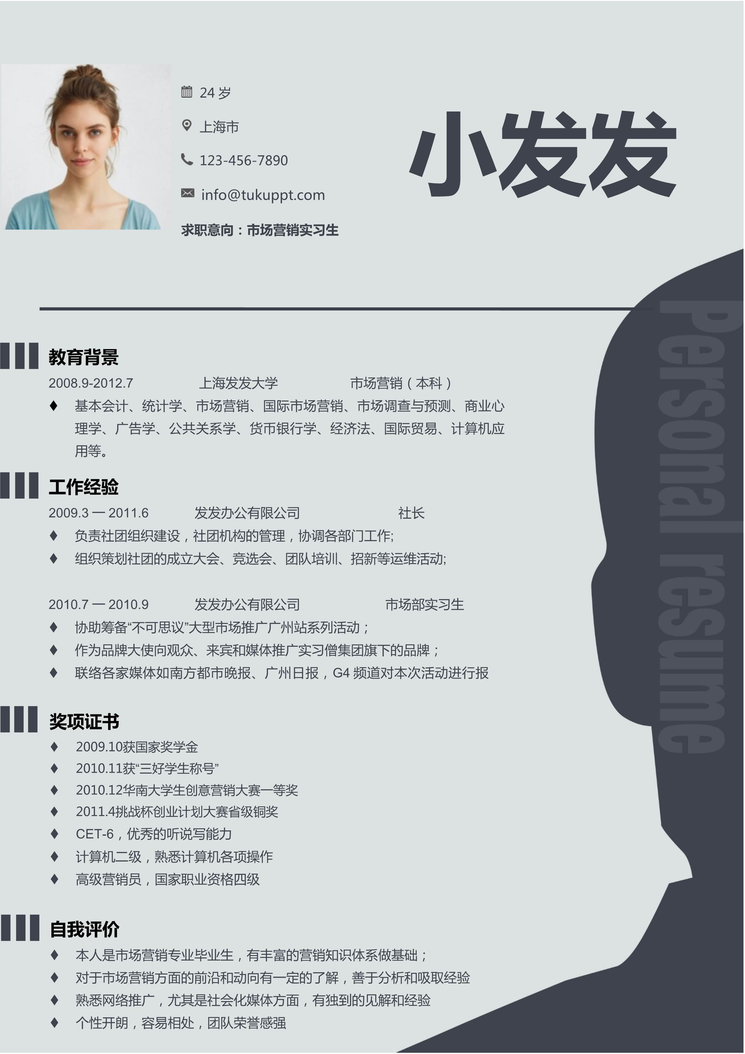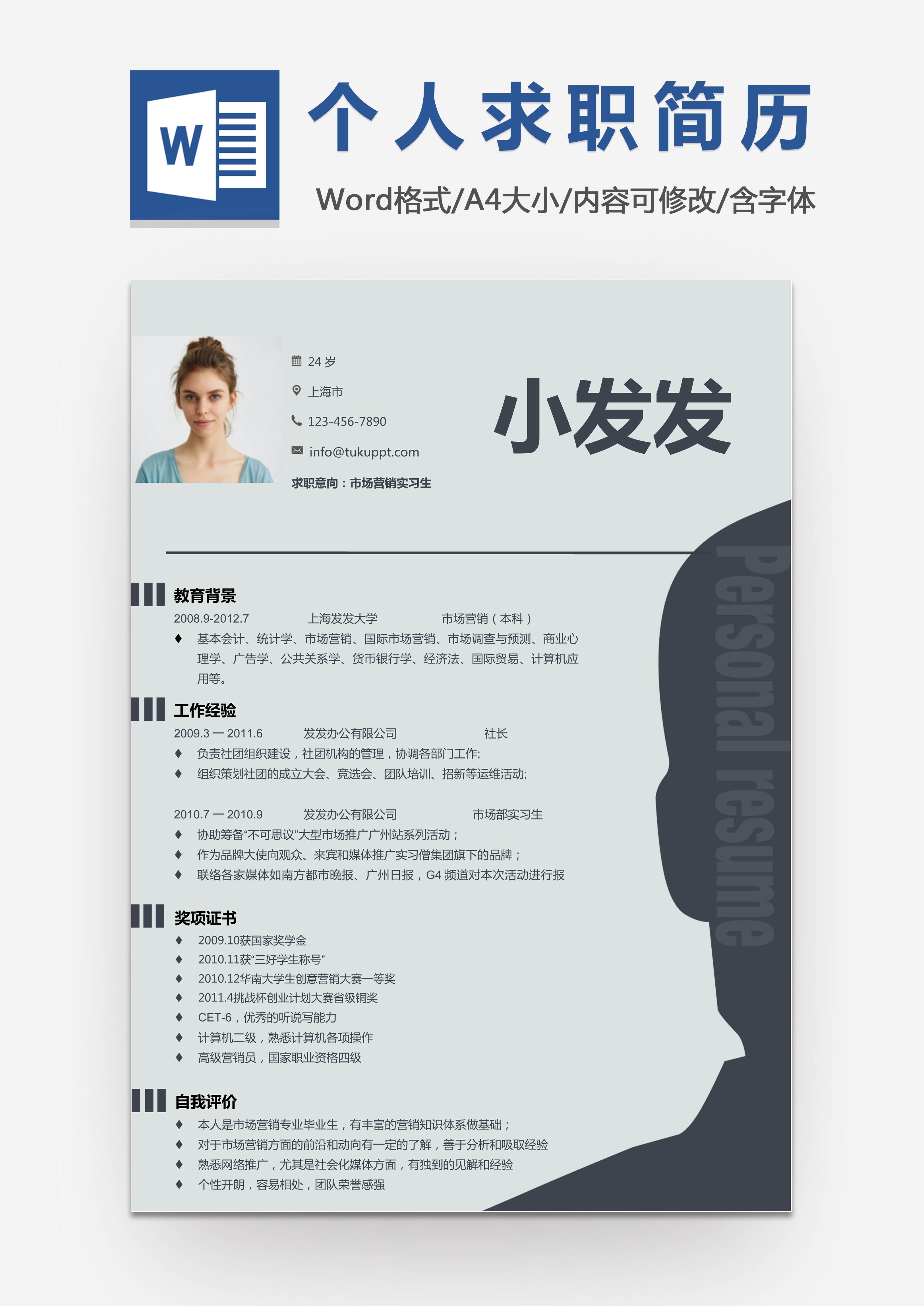 本作品内容为创意时尚市场营销个人求职简历word模板, 格式为 docx, 大小1.57 MB, 页数为1, 请使用软件Word打开, 作品中主体文字及图片可替换修改,文字修改可直接点击文本框进行编辑,图片更改可选中图片后单击鼠标右键选择更换图片,也可根据自身需求增加和删除作品中的内容, 源文件无水印, 欢迎使用发发资源库。 资源下载此资源下载价格为8.8F币,VIP免费,请先登录