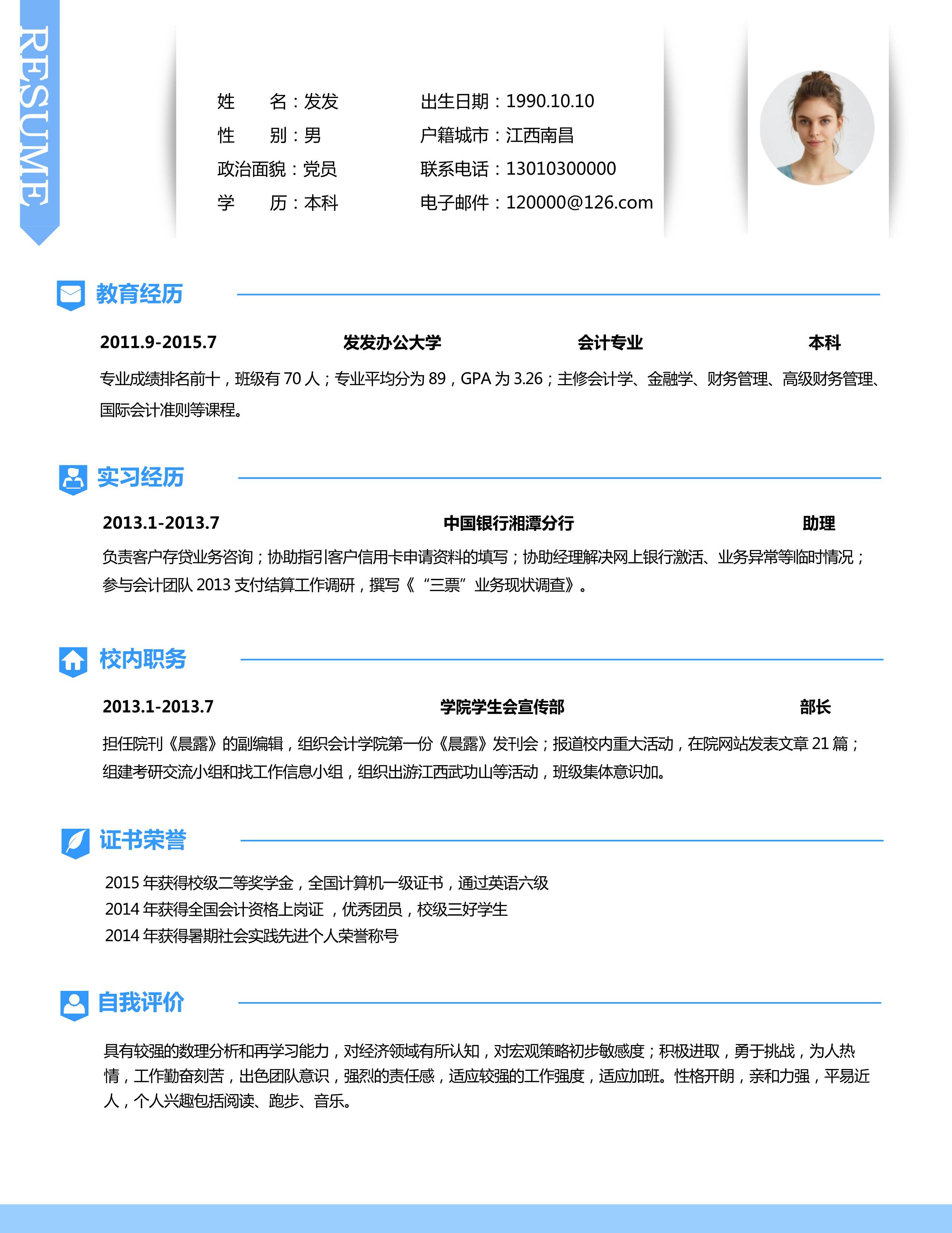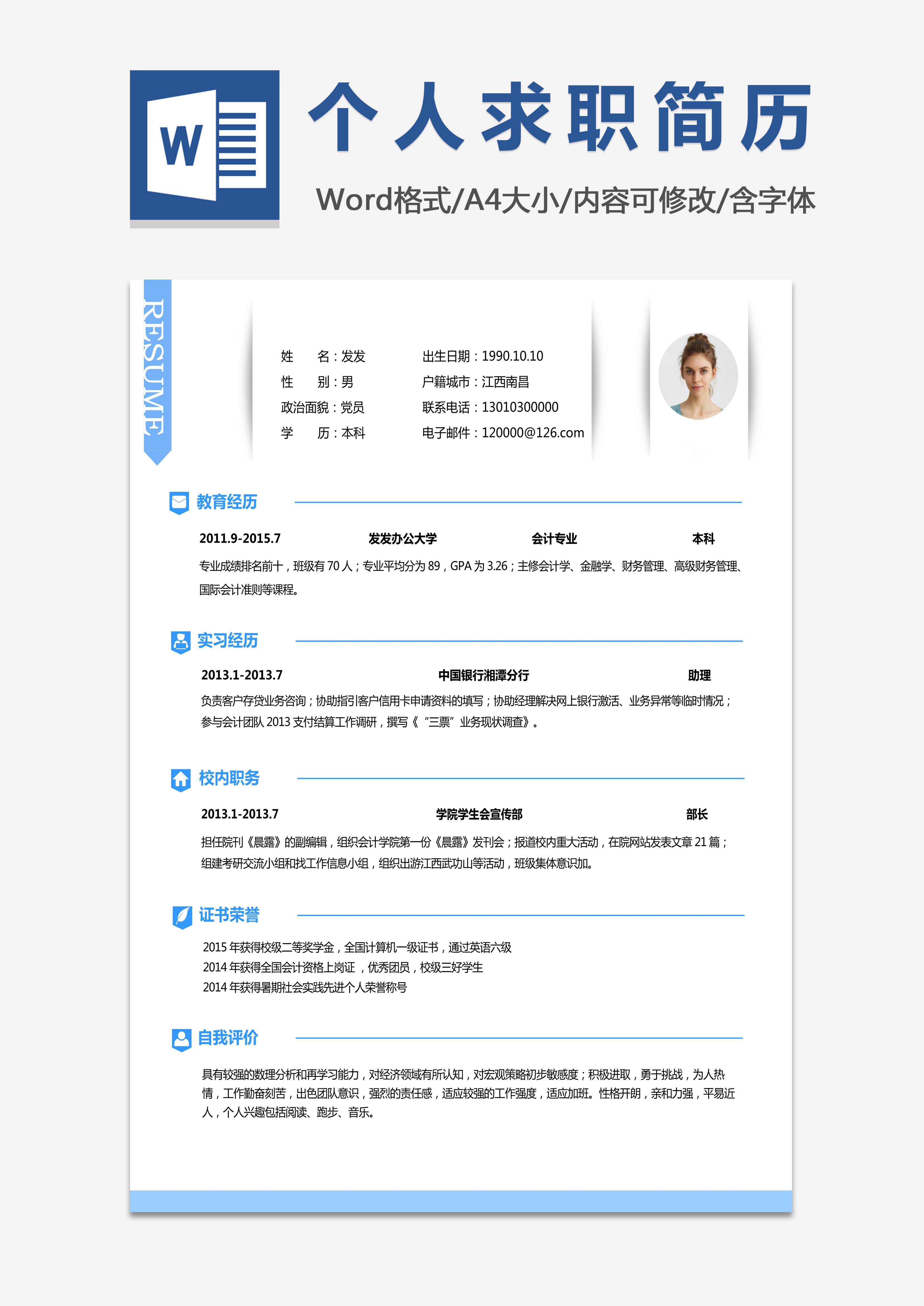 本作品内容为浅蓝色会计专业个人求职简历word模板, 格式为 doc, 大小1.48 MB, 页数为1, 请使用软件Word打开, 作品中主体文字及图片可替换修改,文字修改可直接点击文本框进行编辑,图片更改可选中图片后单击鼠标右键选择更换图片,也可根据自身需求增加和删除作品中的内容, 源文件无水印, 欢迎使用发发资源库。