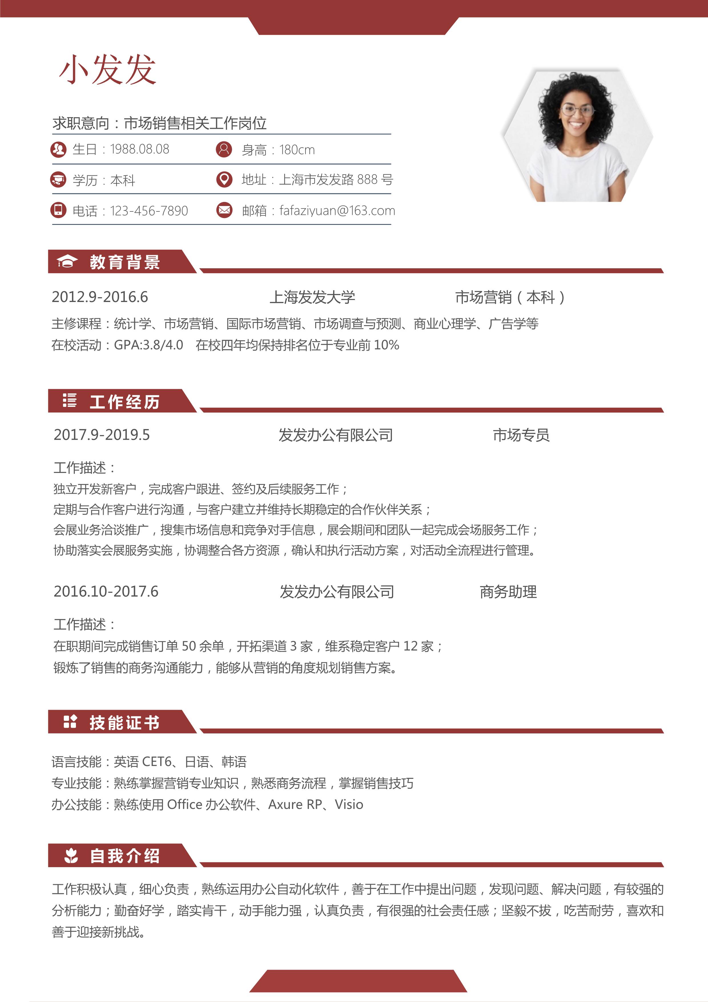 本作品内容为红色经典风格市场销售个人求职简历word模板, 格式为 docx, 大小1.32 MB, 页数为1, 请使用软件Word打开, 作品中主体文字及图片可替换修改,文字修改可直接点击文本框进行编辑,图片更改可选中图片后单击鼠标右键选择更换图片,也可根据自身需求增加和删除作品中的内容, 源文件无水印, 欢迎使用发发资源库。