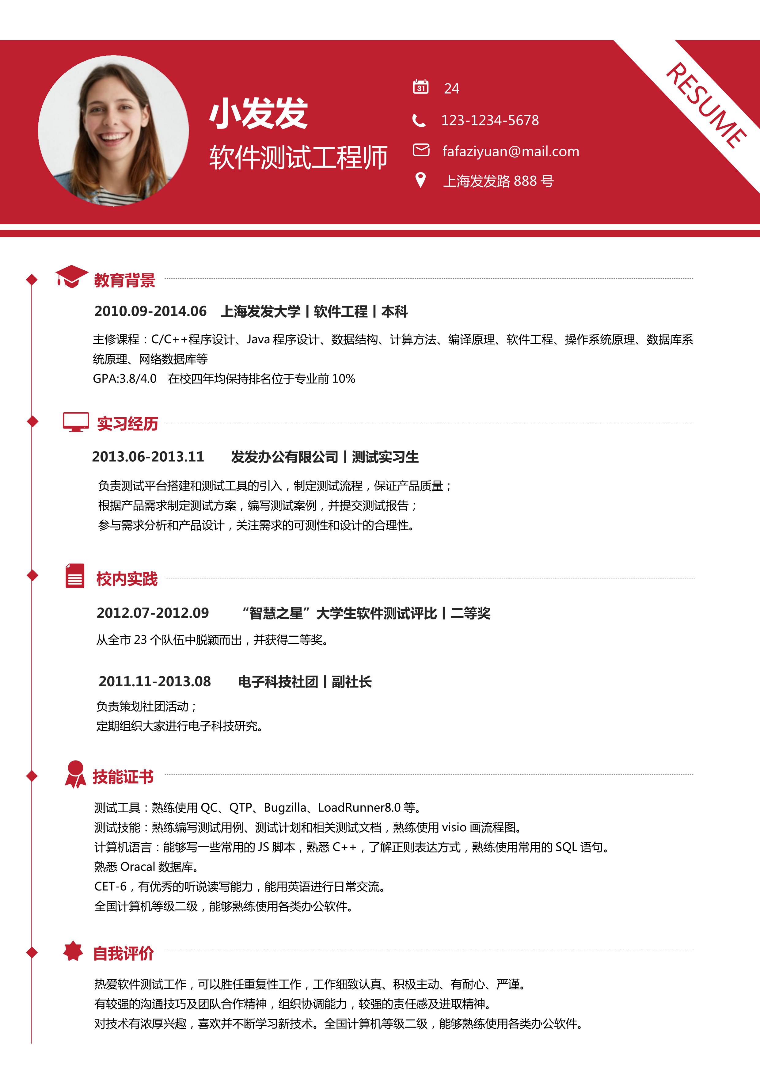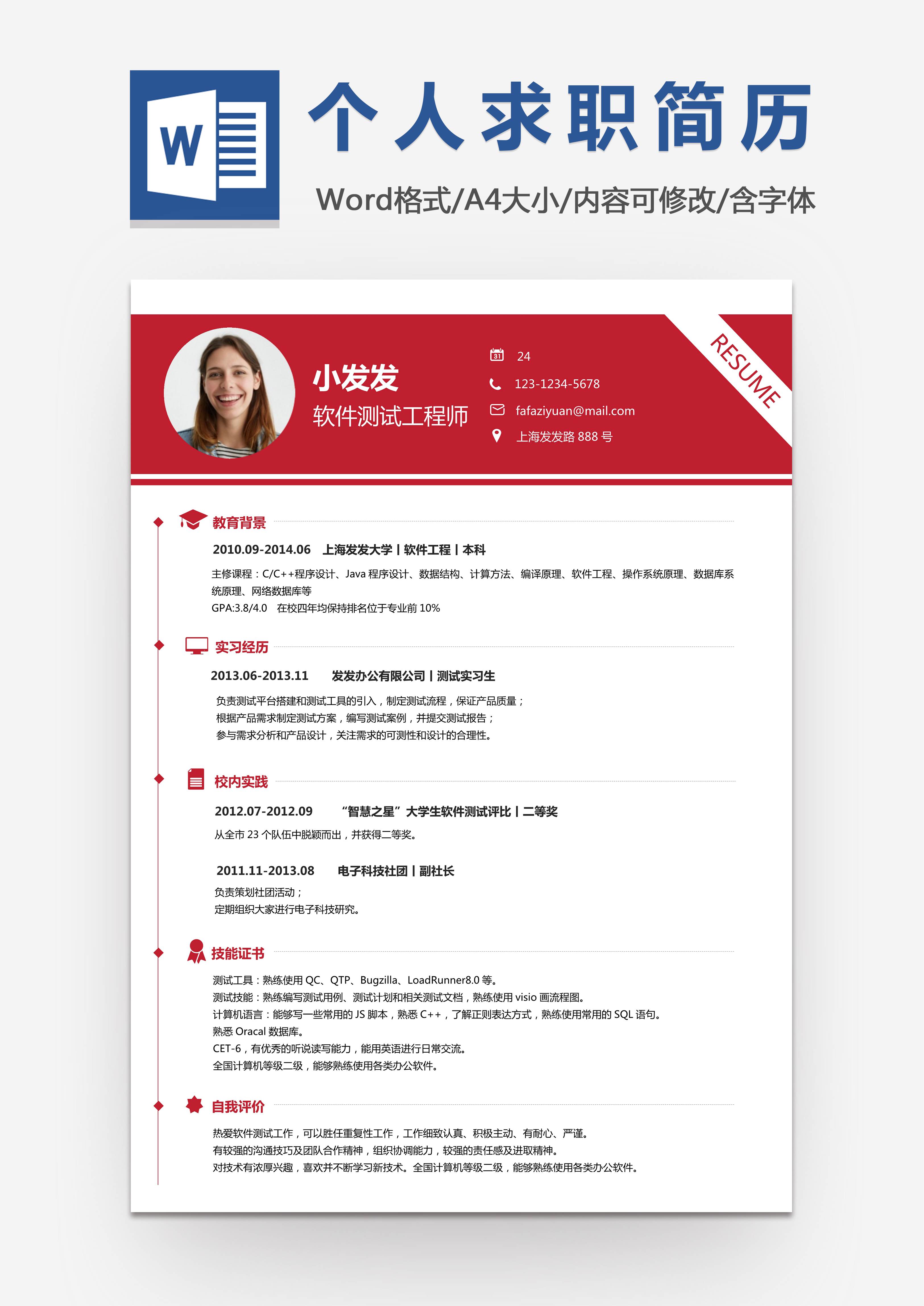 本作品内容为红色经典风格软件测试个人求职简历word模板, 格式为 docx, 大小1.71MB, 页数为1, 请使用软件Word打开, 作品中主体文字及图片可替换修改,文字修改可直接点击文本框进行编辑,图片更改可选中图片后单击鼠标右键选择更换图片,也可根据自身需求增加和删除作品中的内容, 源文件无水印, 欢迎使用发发资源库。 资源下载此资源下载价格为8.8F币,VIP免费,请先登录